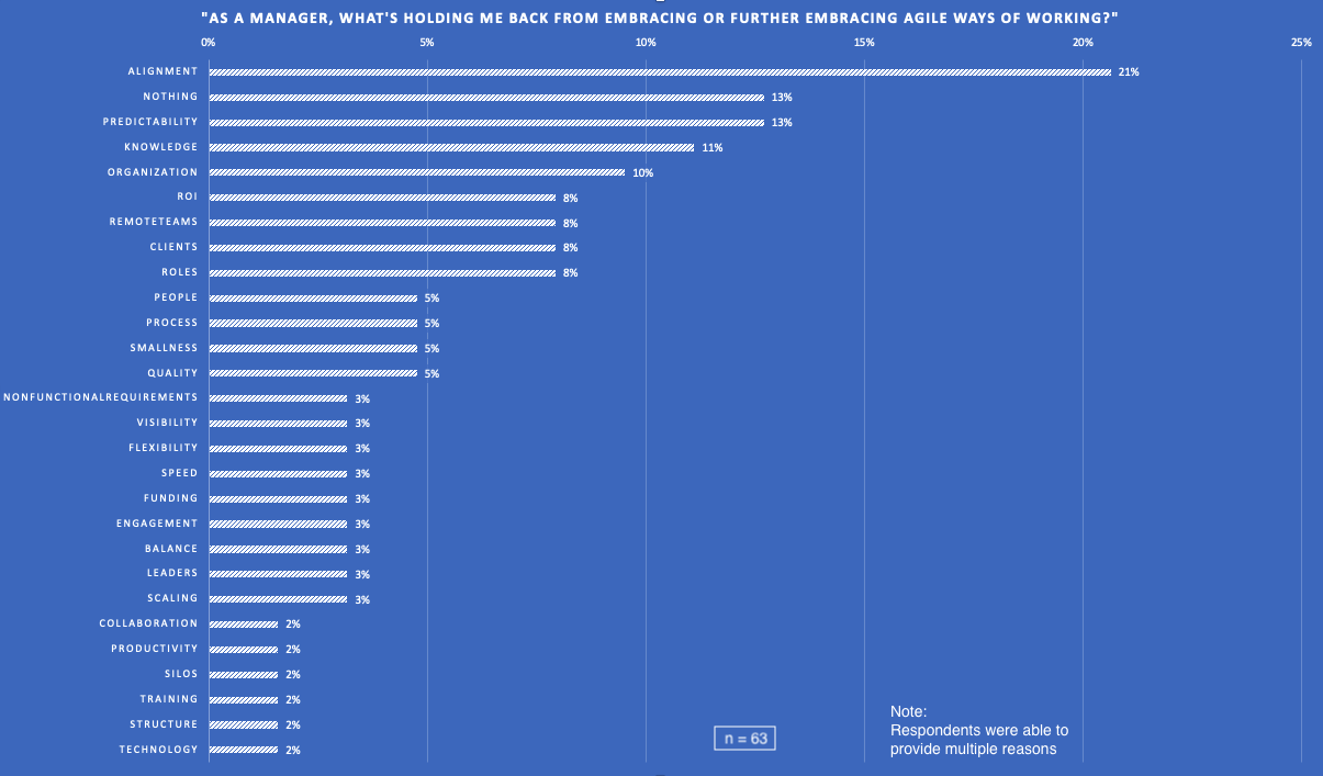 I’ve always been curious as to how managers perceived Agile ways of working. I’ve sought out their perspective whenever I’ve had a chance. So, I polled managers in my network over the last 3 months on what was holding them back from embracing or further embracing Agile ways of working. Here’s a summary of what they had to say.