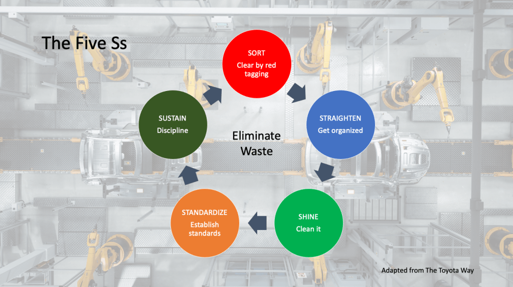 5S was developed in Japan and popularized by Toyota as part of their Toyota Production System for lean manufacturing. It was created to nurture and sustain a clean and tidy manufacturing workplace environment and culture.