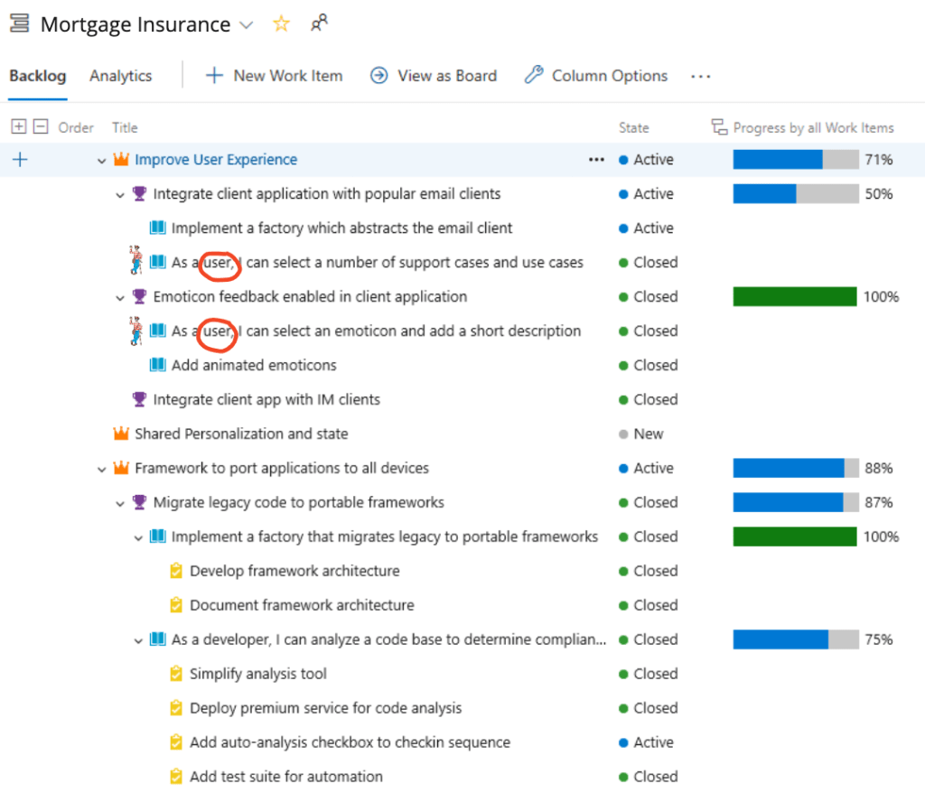 When these same organizations start to transition to Agile and most commonly, Scrum ways of developing software, the most common way to communicate the work that needs to get done in the Product and Sprint Backlogs are product backlog items (PBIs) written as a User Story.