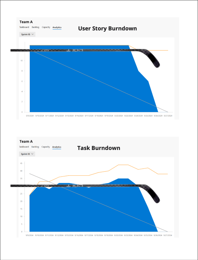 When I look at the sprint burndown chart for some Scrum teams, I see a shape that resembles a hockey stick with shaft held horizontal and toe pointing down.